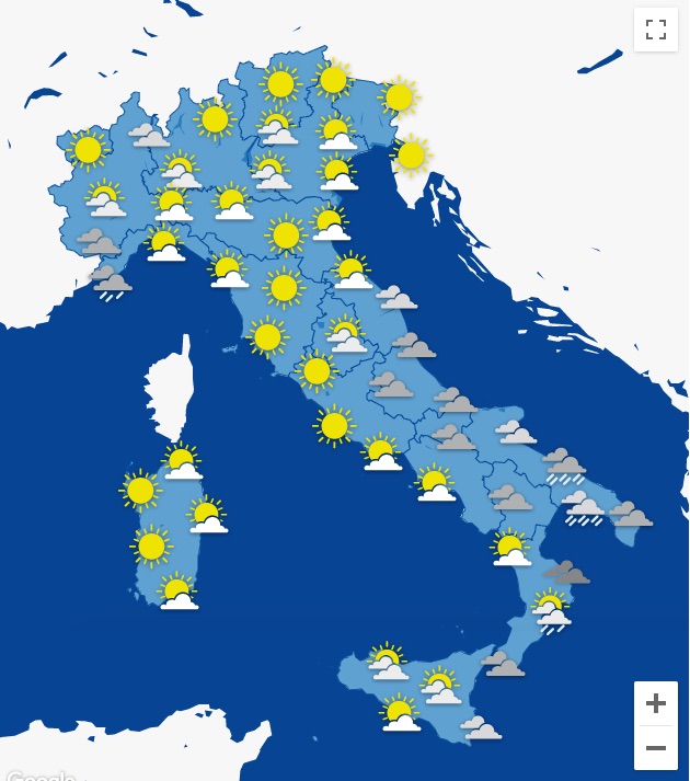 Di seguito trovi una mappa dell'Italia con le previsioni del tempo e l'indicazione della temperatura (minima e massima). Clicca sui em giorni per visualizzare le previsioni relative alla data selezionata, oppure clicca sulle icone nella mappa per accedere alle informazioni meteo relative alle città italiane.